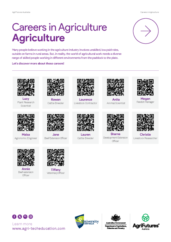 DownloadMany people believe working in the agriculture industry involves unskilled, low-paid roles, outside on farms in rural areas. But, in reality, the world of agricultural work needs a diverse range of skilled people working in different environments from the paddock to the plate. Discover more about these careers by scanning the QR codes in this fact sheet.