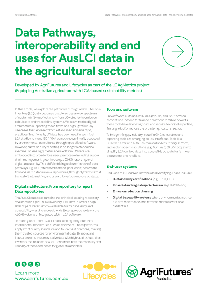 This document developed by AgriFutures and Lifecycles as part of the LCAgMetrics project, examines the pathways, interoperability and applications of AusLCI data in the agricultural sector. It highlights how Life Cycle Inventory (LCI) data, traditionally used in technical Life Cycle Assessment (LCA) studies, is now integrated into broader business practices like supply chain management, greenhouse gas reporting and digital traceability.