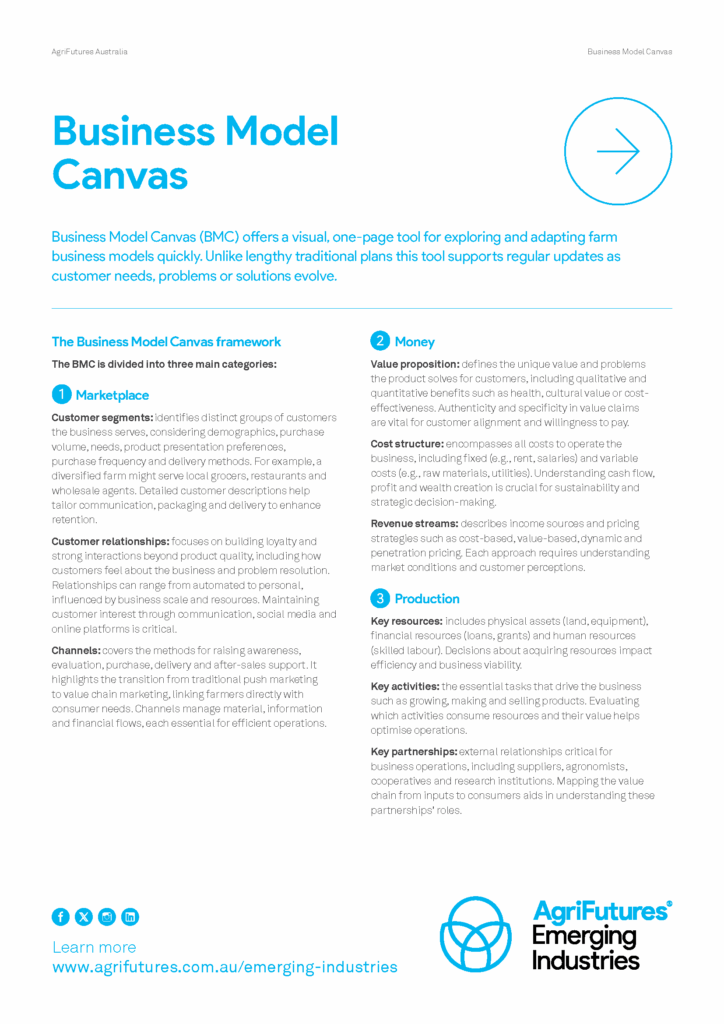 Business Model Canvas (BMC) offers a visual, one-page tool for exploring and adapting farm business models quickly. Unlike lengthy traditional plans this tool supports regular updates as customer needs, problems or solutions evolve.