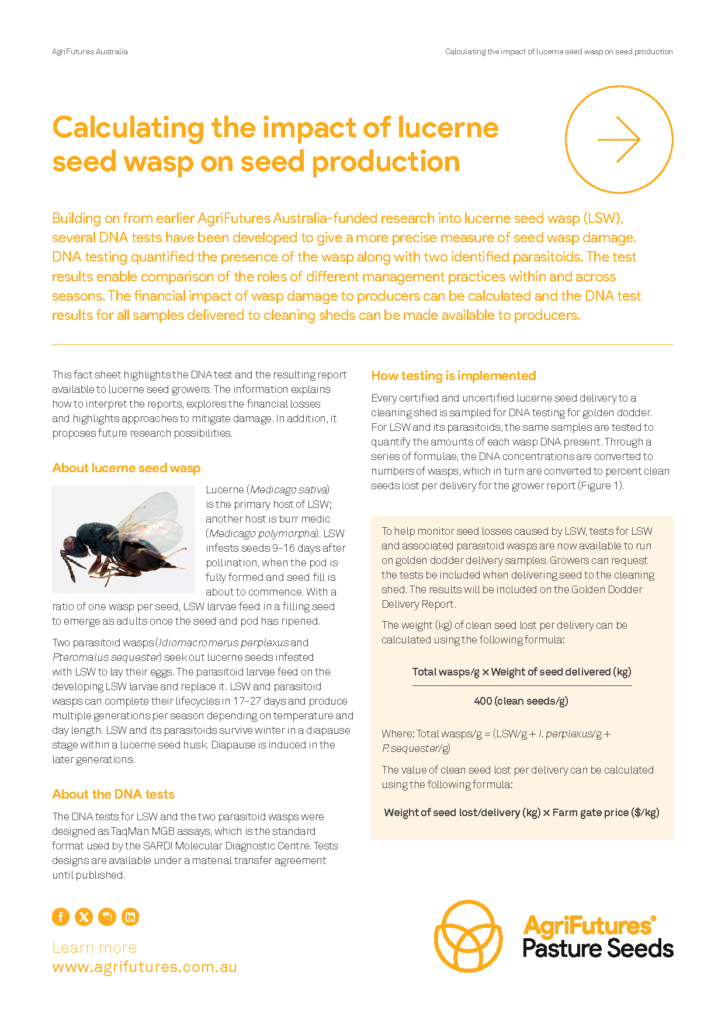 Building on from earlier AgriFutures Australia-funded research into lucerne seed wasp (LSW), several DNA tests have been developed to give a more precise measure of seed wasp damage. DNA testing quantified the presence of the wasp along with two identified parasitoids. The test results enable comparison of the roles of different management practices within and across seasons. The financial impact of wasp damage to producers can be calculated and the DNA test results for all samples delivered to cleaning sheds can be made available to producers.