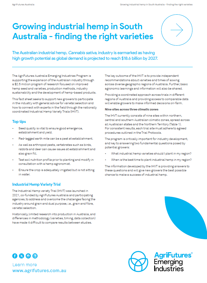 This fact sheet seeks to support new growers to participate in the industry with general advice for varietal selection and how to connect with experts in the field through the nationally coordinated Industrial Hemp Variety Trials (IHVT).