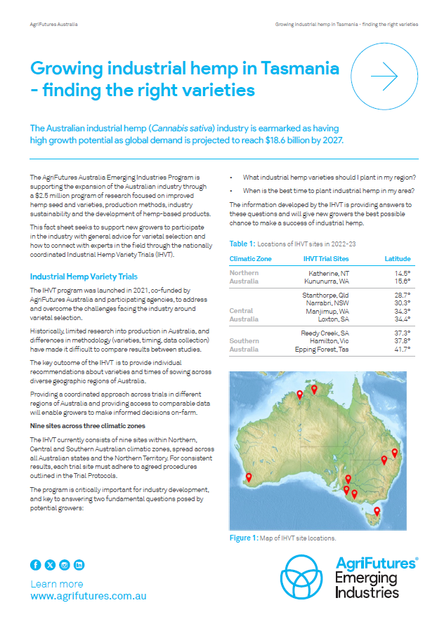 This fact sheet seeks to support new growers to participate in the industry with general advice for varietal selection and how to connect with experts in the field through the nationally coordinated Industrial Hemp Variety Trials (IHVT).