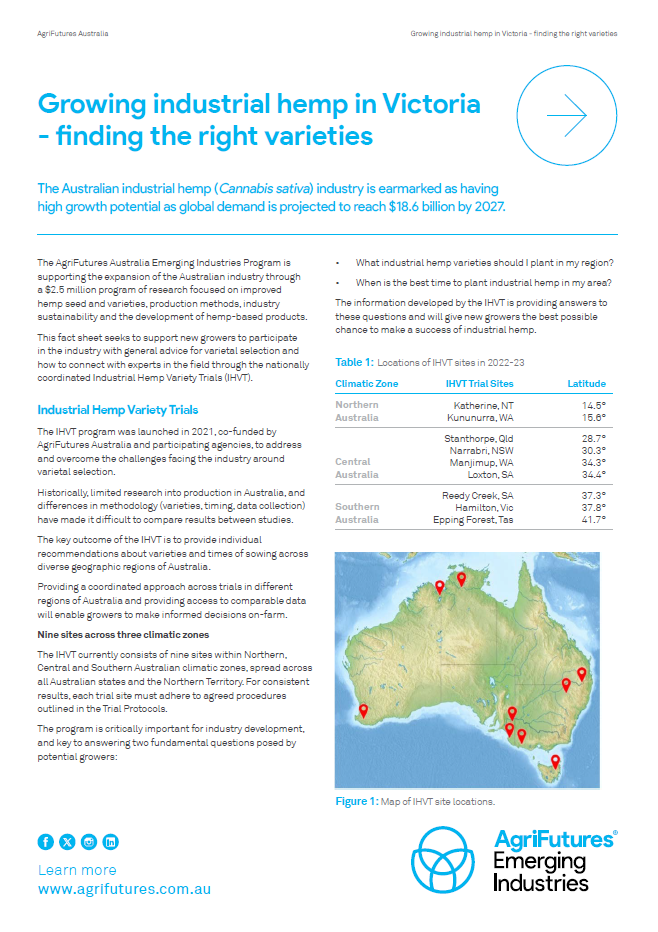 This fact sheet seeks to support new growers to participate in the industry with general advice for varietal selection and how to connect with experts in the field through the nationally coordinated Industrial Hemp Variety Trials (IHVT).
