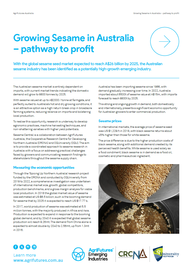 Sesame Central is a collaboration between AgriFutures Australia, the Cooperative Research Centre for Developing Northern Australia (CRCNA) and CQUniversity (CQU). The aim is to provide a coordinated approach to sesame research in Australia with a focus on addressing practical challenges faced by growers and communicating research findings to stakeholders throughout the sesame supply chain.