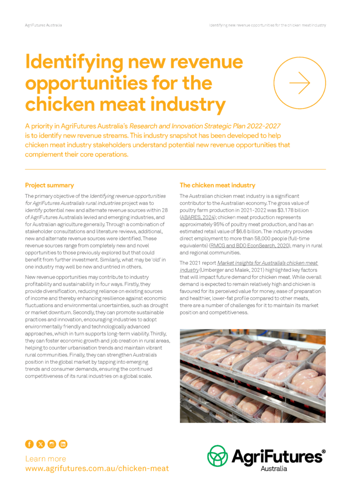 The primary objective of the Identifying revenue opportunities for AgriFutures Australia’s rural industries project was to identify potential new and alternate revenue sources within 28 of AgriFutures Australia’s levied and emerging industries, and for Australian agriculture generally. Through a combination of stakeholder consultations and literature reviews, additional, new and alternate revenue sources were identified. These revenue sources range from completely new and novel opportunities to those previously explored but that could benefit from further investment. Similarly, what may be ‘old’ in one industry may well be new and untried in others.