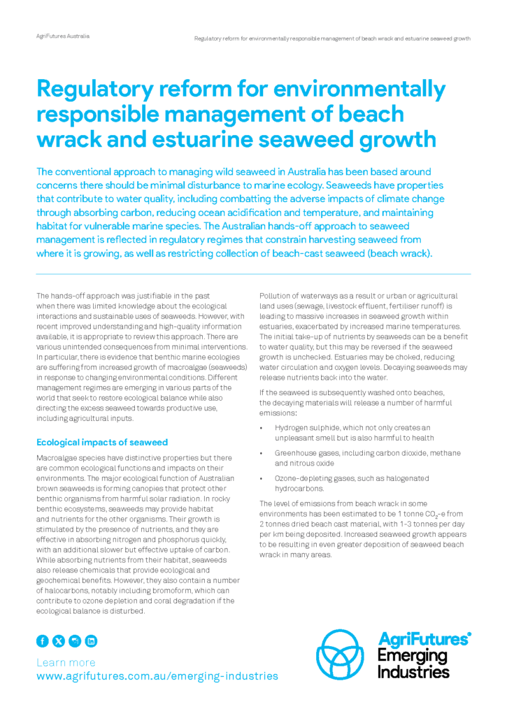 DownloadThe conventional approach to managing wild seaweed in Australia has been based around concerns there should be minimal disturbance to marine ecology. Seaweeds have properties that contribute to water quality, including combatting the adverse impacts of climate change through absorbing carbon, reducing ocean acidification and temperature, and maintaining habitat for vulnerable marine species. The Australian hands-off approach to seaweed management is reflected in regulatory regimes that constrain harvesting seaweed from where it is growing, as well as restricting collection of beach-cast seaweed (beach wrack).