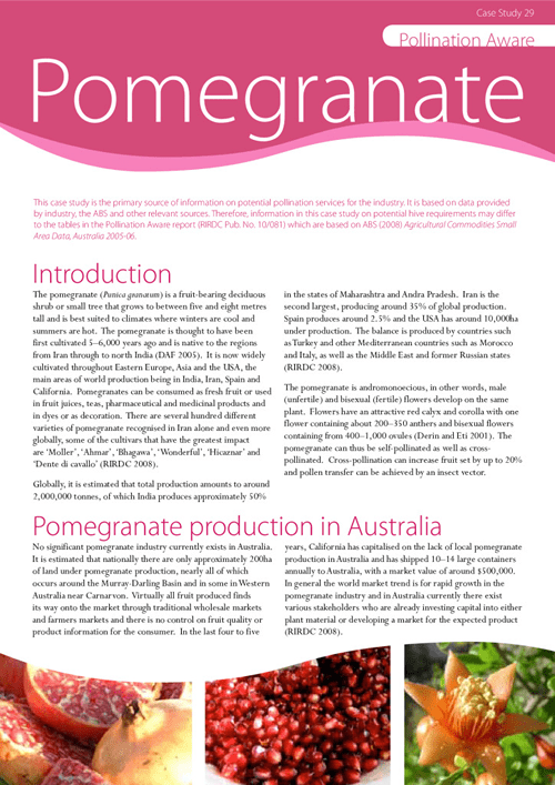 This case study is one of 35 presented as part of the Pollination Aware – The Real Value of Pollination in Australia (RIRDC Pub. No. 10/081) research project. The case studies provide analyses of the pollination process and its management in a range of pollination-responsive commodities produced in Australia. Each case study deals with a single pollination-responsive commodity or a small group of commodities that are either closely related genetically or that have much in common in the management of their pollination.