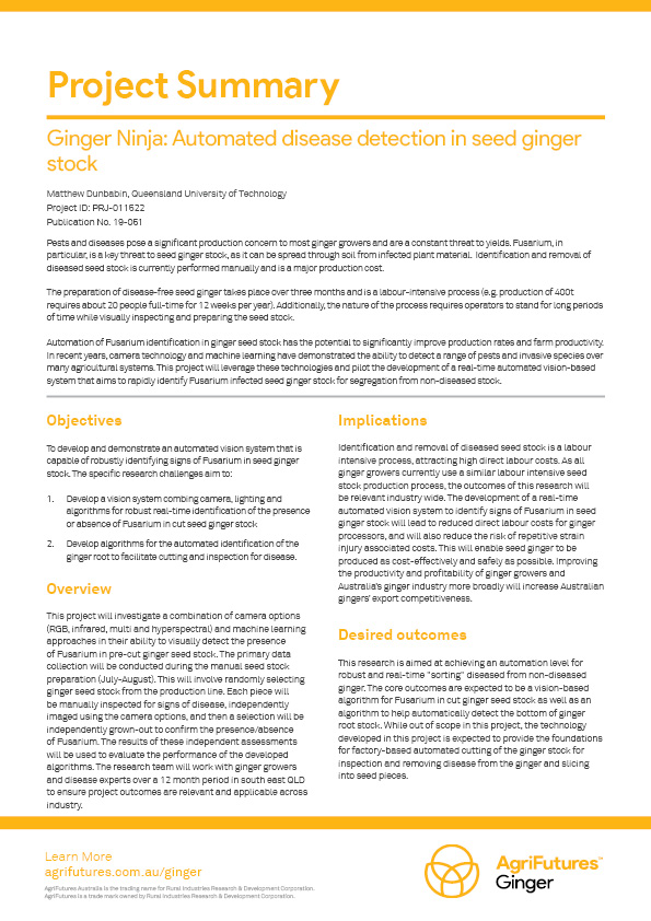 Pests and diseases pose a significant production concern to most ginger growers and are a constant threat to yields. Fusarium, in particular, is a key threat to seed ginger stock, as it can be spread through soil from infected plant material. Identification and removal of diseased seed stock is currently performed manually and is a major production cost.